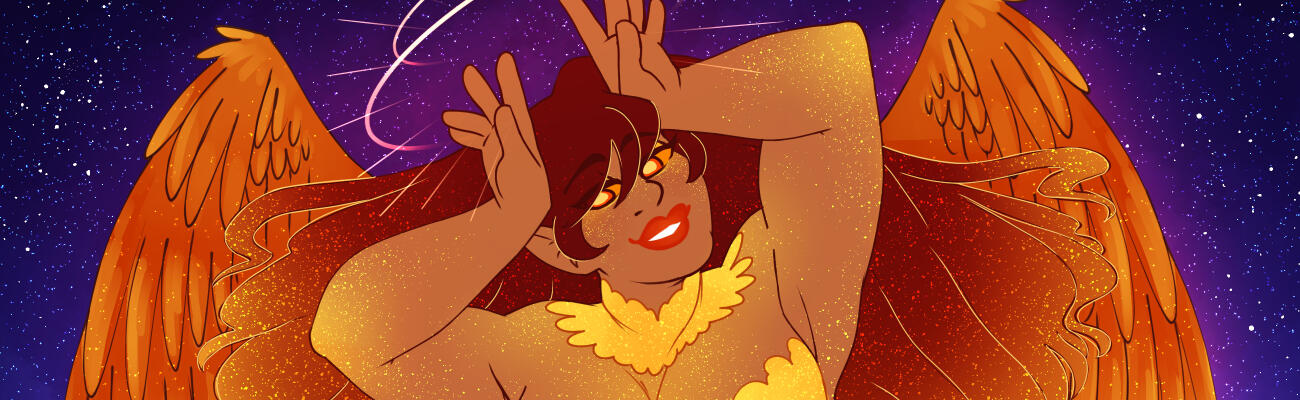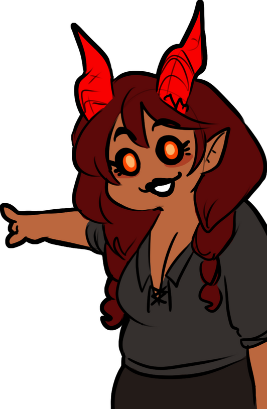 My character is 5’9ft with an hourglass shaped body and is fat with a tummy, she has small lightning shaped horns and a tail that ends in a small heart. Her skin color is a healthy tan color like this [color reference]. She has dark red hair that is tied in twin braids going over her shoulders. She has orange eyes and yellow sclera.The outfit I want her in is this [Picture reference/you are describing the dress + the colors and or patterns you want on it] outfit, jumping with her hands in the air. She has a bubbly personality and she has a bright smile.